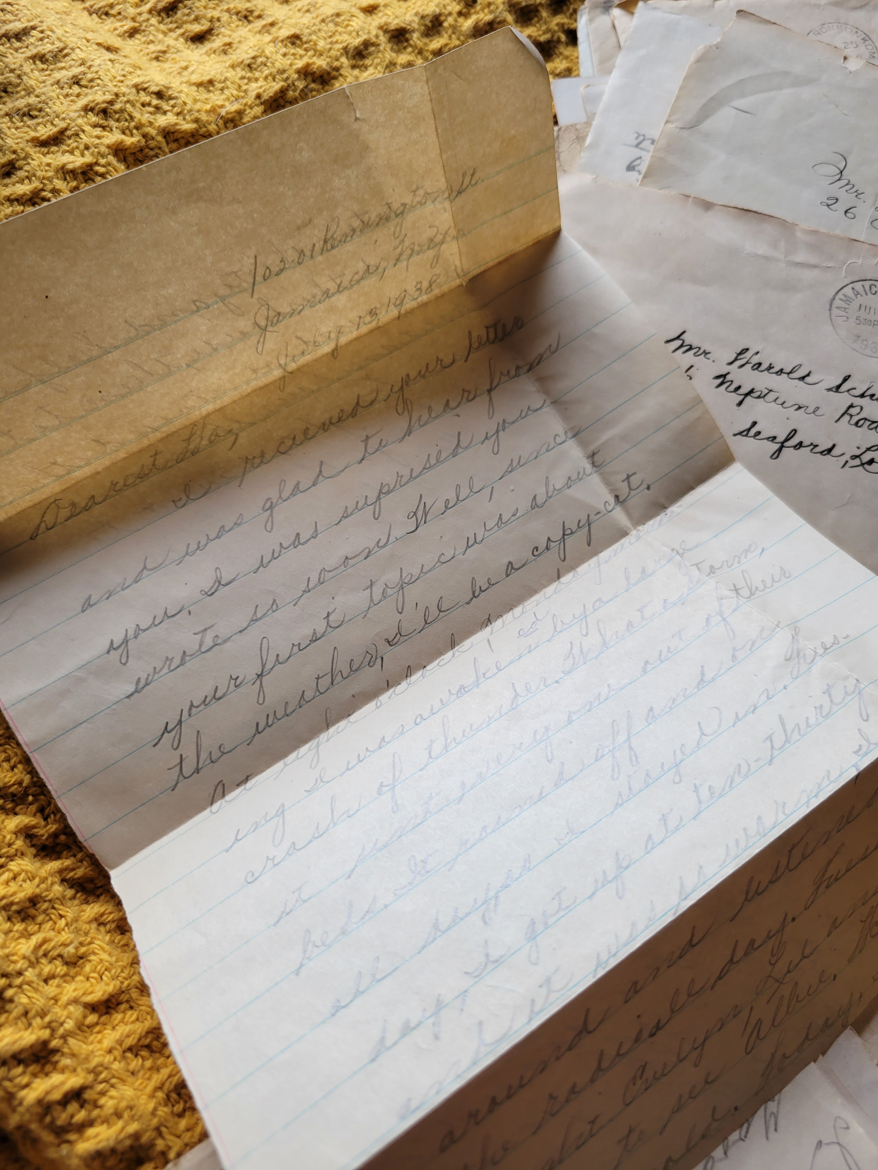 I received your letter and was glad to hear from you. I was surprised you wrote so soon. Well, since your first topic was about the weather, I’ll be a copycat. At eight o’clock, Monday morning I was awakened by a large crash of thunder. What a storm it sent everyone out of their beds. It rained off and on all day, so I stayed in. Tuesday, I got up at ten thirty and it was so warm, I sat around and listened to the radio all day. Tuesday night Evelyn, Lil, and I went to see Albie. He has a heavy cold. Today, I got up at ten thirty and helped around the house, then to the playground. I stayed there about an hour then came home. Tonight, I went to a meeting, then to Nachlin’s. Later, Harry took several of us including Lil, Betty, Gert, Ed W., Eppie, and myself to the night baseball game on Hillside Ave. I go in at 11:30 and boy! Did I get a balling-out.