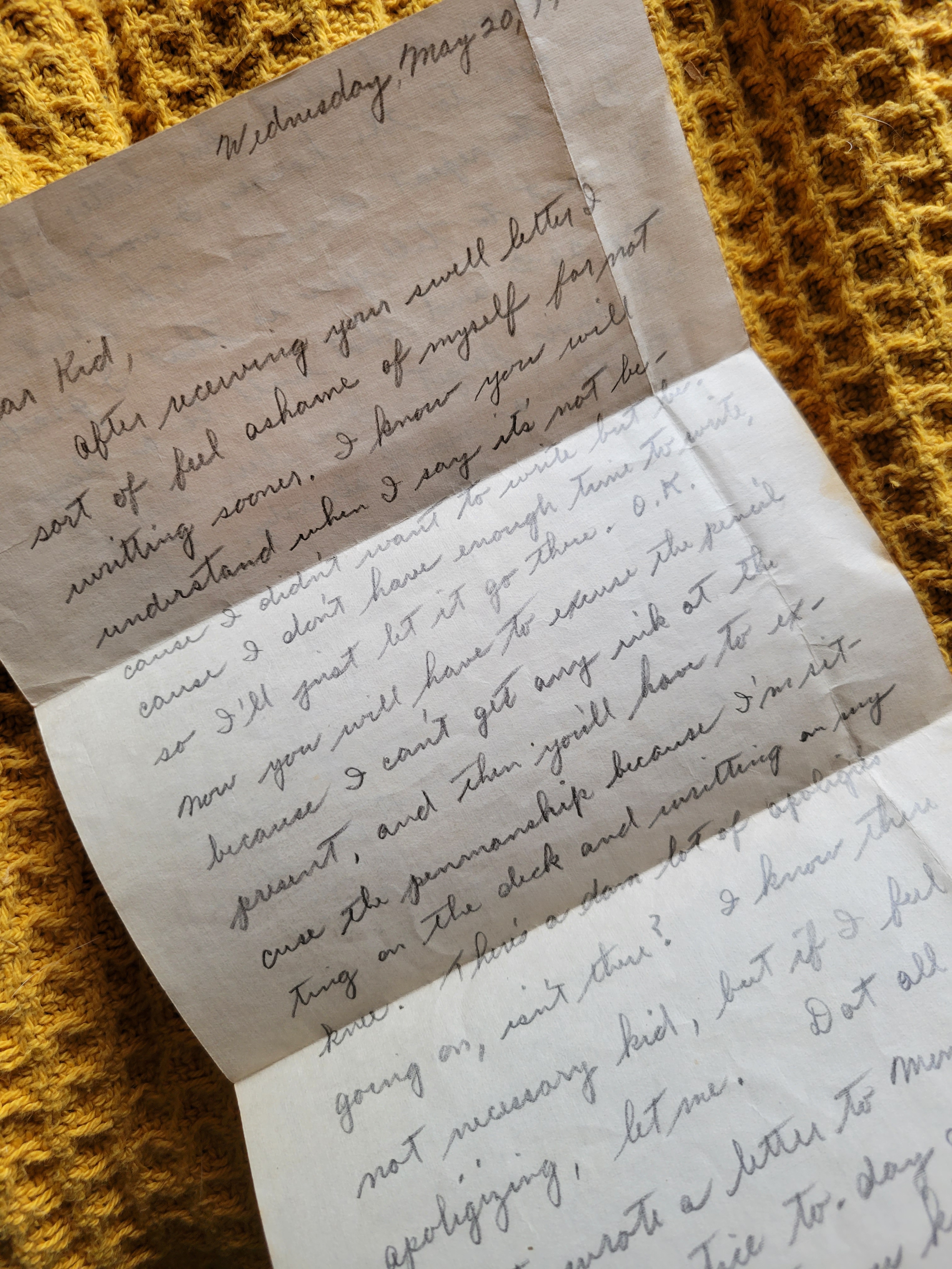 After receiving your swell letter I sort of feel ashamed of myself for not writing sooner. I know you will understand when I say it’s not because I didn’t want to write but because I don’t have enough time to write, so I’ll just let it got here. O.K. Now you will have to excuse the pencil because I can’t get any ink at the present, and then you’ll have to excuse the penmanship because I’m sitting on the deck and writing on my knee. There’s a dam lot of apologies doing on, isn’t there? I know they’re not necessary kid, but if I feel like apologizing, let me. Dot all.