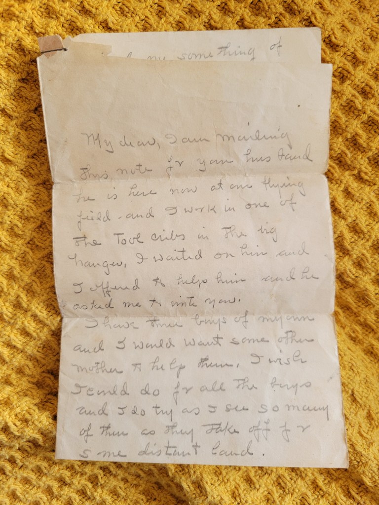 I am mailing this note for your husband. He is here now at our flying field, and I work in one of the tool cribs in the big hanger. I waited on him and I offered to help him and he asked me to write you.