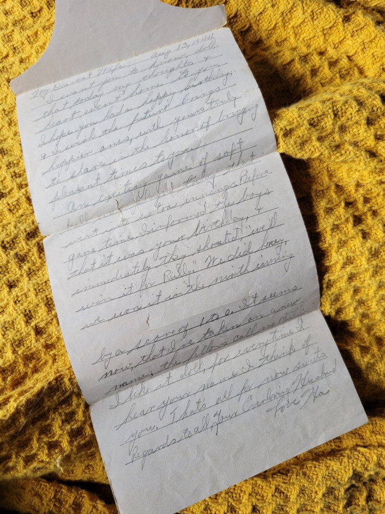 An exciting game of softball was played today that went into extra innings. Before game time, I informed the boys that it was your birthday and immediately they shouted, “We’ll win it for Reilly.” We did honey, we won it in the ninth inning by a score of 1 to 0. It seems now, that I’ve taken on a new name; the fellows call me Reilly. I like it doll, for every time I hear your name I think of you. That’s all for now sweets. Regards to all.